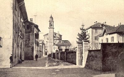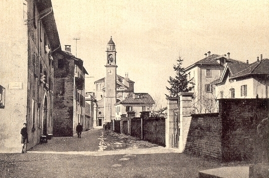 La Chiesa Parrocchiale San Martino, con il campanile nella piazza antistante, vista dall'attuale via G. Brusa (anni '40) - collezione A. Buzzi