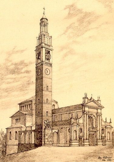 Progetto del nuovo campanile posto al fianco della Chiesa, opera dell'architetto G. Brusa (anni '40) - collezione A. Buzzi