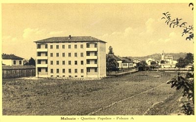 Primo edificio delle case popolari di Viale delle Vittorie; sulla sinistra le baracche che ospitavano gli sfollati (1949) - collezione A. Buzzi