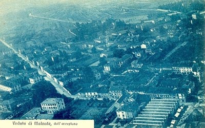 La più antica veduta aerea di Malnate; in basso a destra piazza Repubblica con, in evidenza i tetti dello stabilimento Braghenti, ora abbattuto; verso sinistra, in basso, Villa Talacchini (cfr. Ville 1), attuale sede del Comune (anni '20) - collezione A. Buzzi