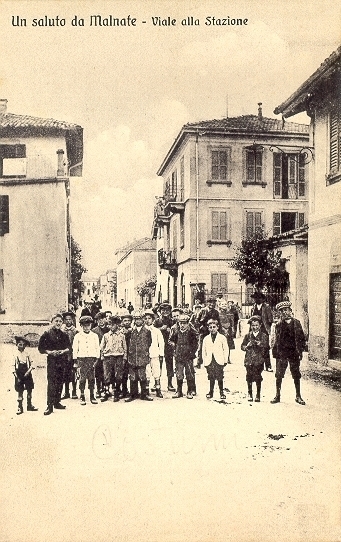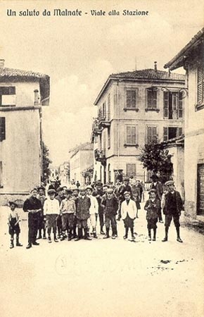 Viale alla Stazione, poi via Ferrer, via Italia, via Roma e ora via Matteotti, all'incrocio con via De Mohr e via San Giuseppe, in direzione della stazione; a destra si intravede la cappella di San Giuseppe, poi spostata sul lato opposto della via (1920) - collezione A. Buzzi