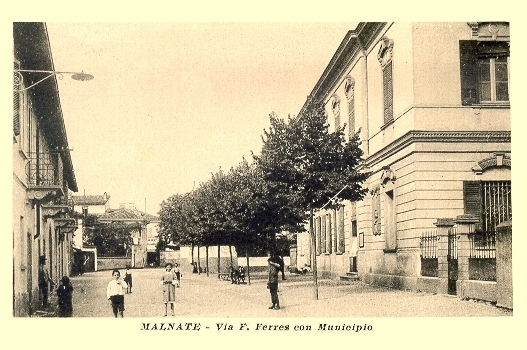All'incrocio con via De Mohr, a destra il vecchio Municipio con il cancelletto di ingresso alla Scuola (1910) - collezione A. Ambrosetti