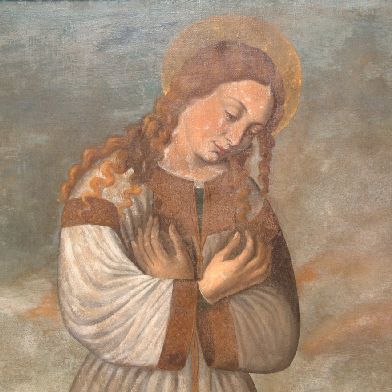Il biancore della veste della Vergine fa risaltare la figura principale che si staglia lunga e solenne, con le braccia incrociate sul petto, colta nell'atto di inginocchiarsi davanti al Bambino che le sta ai piedi. La tunica è complicata, all'orientale, con una ricca passamaneria dorata intorno allo scollo e lungo i polsi. Il volto, incorniciato dai capelli sciolti, di un biondo rossastro, ripartiti in lunghi boccoli a torciglione, è tipico delle immagini quattro-cinquecentesche. A riportarci verso la vera epoca del quadro ci vengono in aiuto il viso dolcissimo della Madonna che abbozza un affettuoso sorriso ed il vivace Bambin Gesù, dallo sguardo vispo e penetrante, con due occhietti scuri che ricordano certi scugnizzi della pittura lombarda del Seicento. Tutta lombarda è anche l'atmosfera di grande serenità che pervade la scena.
