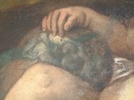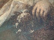 Il Bimbo sostiene con la destra la sfera del mondo, all'interno della quale si può scorgere l'episodio biblico della creazione di Eva, delineato con la tecnica del monocromo. È evidente il contrappunto che l'artista, su suggerimento di un dotto e devoto committente, ha voluto istituire tra la vecchia Eva, quella della mela e del peccato originale, e la nuova Eva, quella che ha donato il Redentore all'umanità. Il Bimbo sorride alla Madre e stringe nella mano sinistra una rosa bianca, riferimento al Rosario ed all'attributo di Rosa mistica dato nelle litanie alla Vergine.