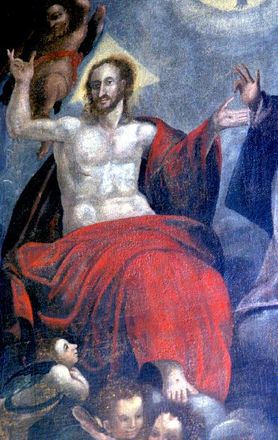 Nella pala emerge in modo particolare la figura di Gesù Cristo, il figlio di Dio fattosi uomo, parzialmente avvolto da un manto di colore rosso intenso che, posato sul braccio sinistro, passa dietro le spalle e poi avvolge le gambe, lasciando scoperti il torace, il braccio destro, la mano sinistra e il piede destro, in cui sono ben visibili i segni della passione: le stimmate e la ferita nel costato; la mano destra, sollevata, sembra indicare il numero tre ed il viso, sofferente, è rivolto verso destra.