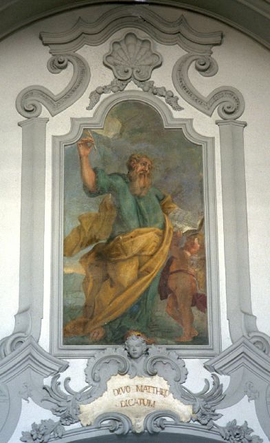 Nella parte centrale dell'abside, sulla parete di innalzamento settecentesca, sopra il capo di un angelo scolpito, vi è un affresco, san Matteo, opera di Giovanni Battista Croci (1757); questo affresco fu motivo di vanto per il paese perchè creava un legame artistico con un'opera di prestigio, forse la più importante dell'oratorio di Varese, quella del Sacro Monte. Il tetto della cappella originaria chiudeva la chiesa proprio ai piedi dell'affresco settecentesco al di sopra della scritta Divo Mattheo dicatum. Sopra la porta di accesso alla sagrestia, vi è un dipinto su tela che rappresenta la Trinità (1740-1750), attribuita a Pietro Antonio Magatti. L'opera viene identificata come la "Trinità", ma, probabilmente, essa era posta a coronamento di una cappella dedicata alla Vergine, ipotesi avvalorata dalla posizione delle figure di Cristo e del Padre Eterno che stanno incoronando qualcuno posto sotto di loro.